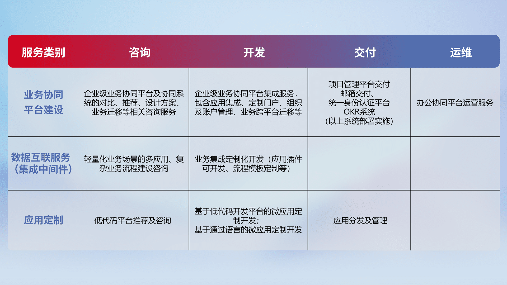 针对钉钉、、、企微、、、、IDaas等平台级产品提供产品的规划、、、方案、、、、交付、、、定制化开发等服务,,,,实现如统一协同办公、、智能客户服务、、、、混合会议管理、、智能数据查询、、、、等业务场景,,实现数字化转型。。。。